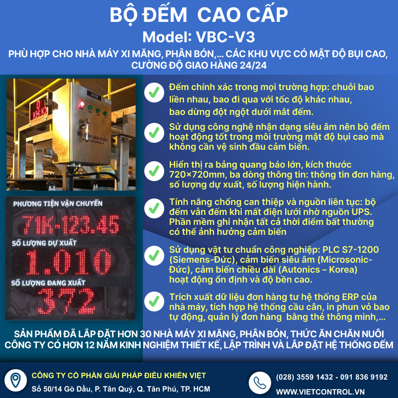 Bộ đếm bao cao cấp VBC-V3, được thiết kế sử dụng vật tư tiêu chuẩn công nghiệp như cảm biến siêu âm của hãng Microsonic (Đức), Carlo Gavazzi (Ý) và bộ lập trình PLC S7-1200 của Hãng Siemens (Đức) cho phép bộ đếm nhận dạng chính xác bao xi măng, phân bón,... trong điều kiện mật độ bụi cao và hoạt động chính xác, tin cậy, bền bĩ trong môi trường sản xuất công nghiệp và xuât hàng cường độ cao 24/24.