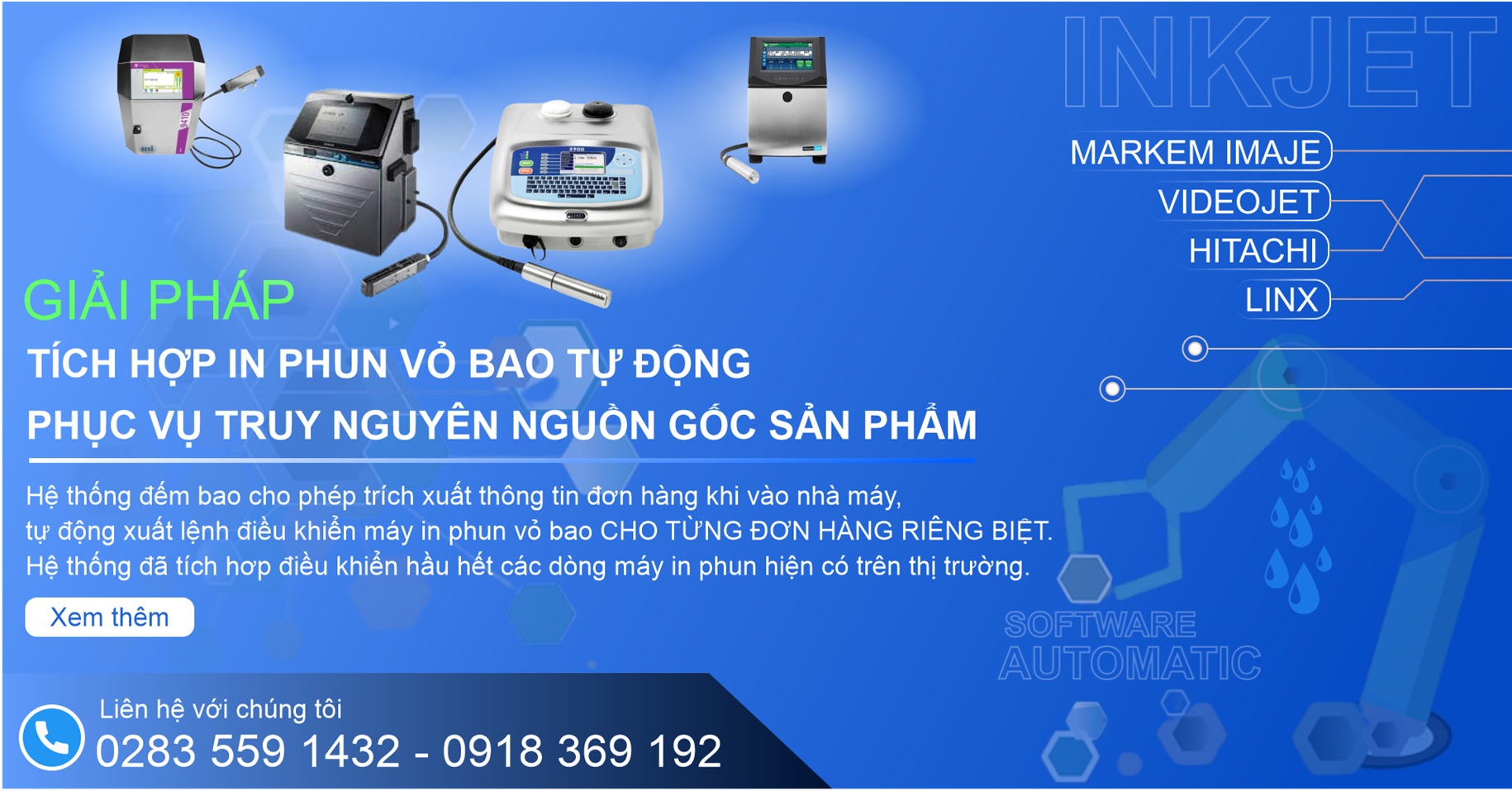 Phần mềm điêu khiển in phun vỏ bao tự động giúp điều khiển máy in phun được chính xác, nhanh chóng và hoàn toàn tự động. Ứng dụng Phần mềm đặc biệt hiệu quả và tiện ích khi kết nối với hệ thống kiểm đếm tự động, kết nối dữ liệu bán hàng, cho phép in tức thời thông tin đơn hàng trên từng sản phẩm xuât hàng, nhập kho ( như in phun vỏ bao xi măng, phân bón, thùng mì gói,...